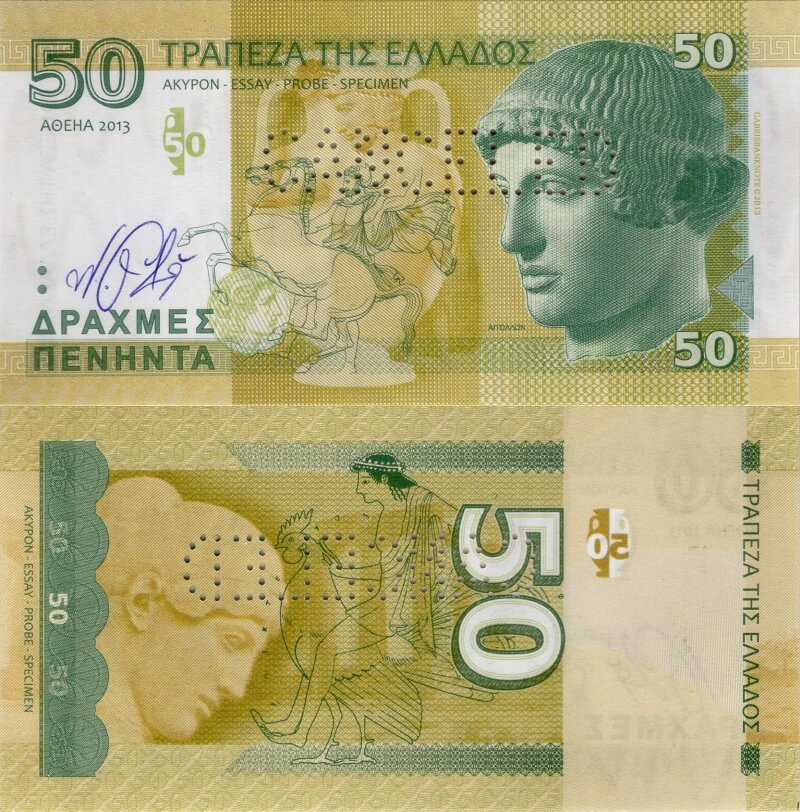 50 drachmas Greece Posted in 2013 Rozměry (mm): 140 x 72 Číslo: Bez číslovače Rozměry (mm): 140 x 72 Číslo: Bez číslovače s perforace CANCELED s podpisem Mateje Gábriše