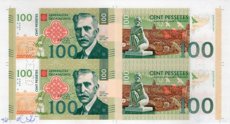 Aršík 100 Pessetes Catalonia 2017 Posted in 2017, Aršíky a ostatní Rozměry (mm): Číslo: Ručně číslováno 12/25 s perforací CANCELED s podpisem Mateje Gábriše