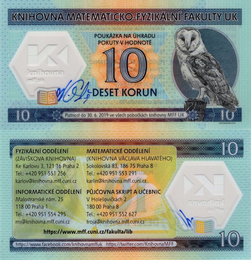 10 korun knihovna MFF UK 2018 Posted in 2018 Rozměry (mm): 141 x 73 Číslo: Bez číslovače Rozměry (mm): 141 x 73 Číslo: Bez číslovače s podpisem Mateje Gábriše