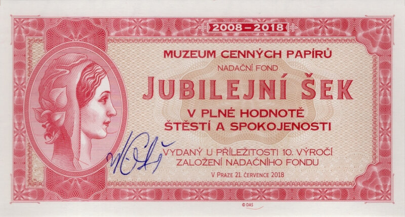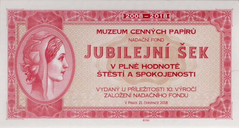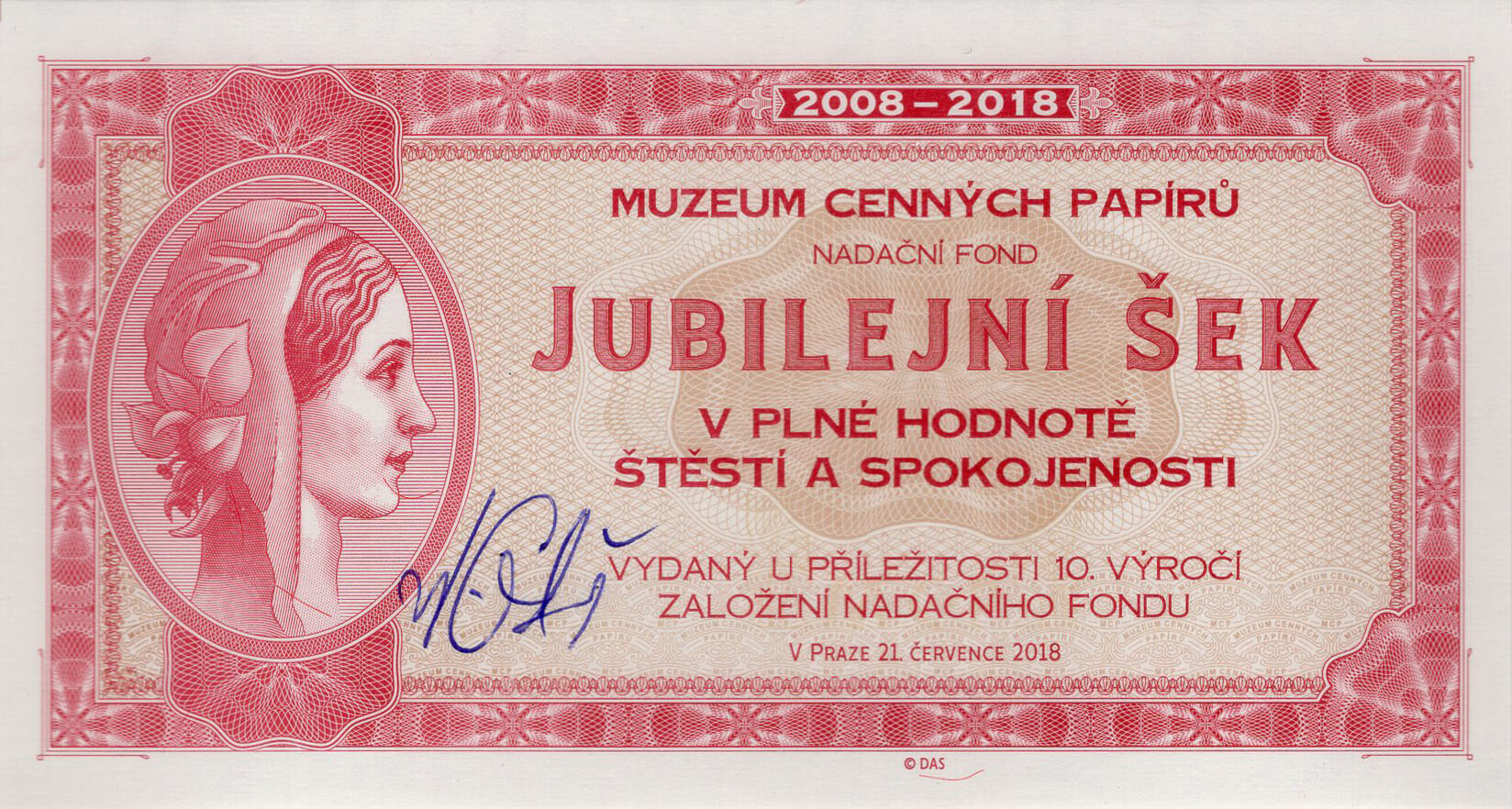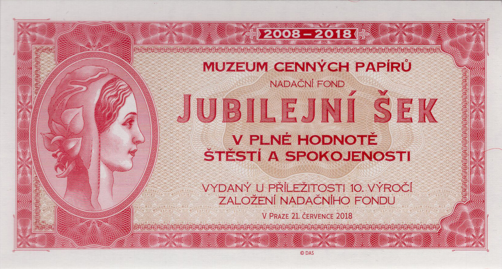 Číslo: Jubilejní šek, bez číslovače, červený podklad, červený portrét