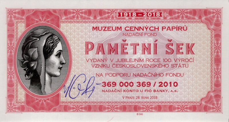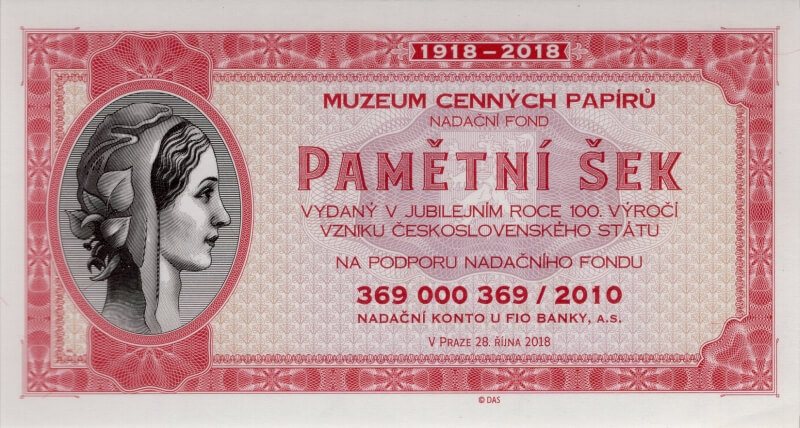 Číslo: Pamětní šek, bez číslovače, červený podklad, černý portrét