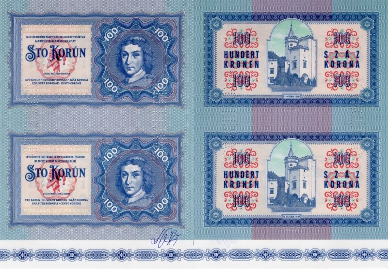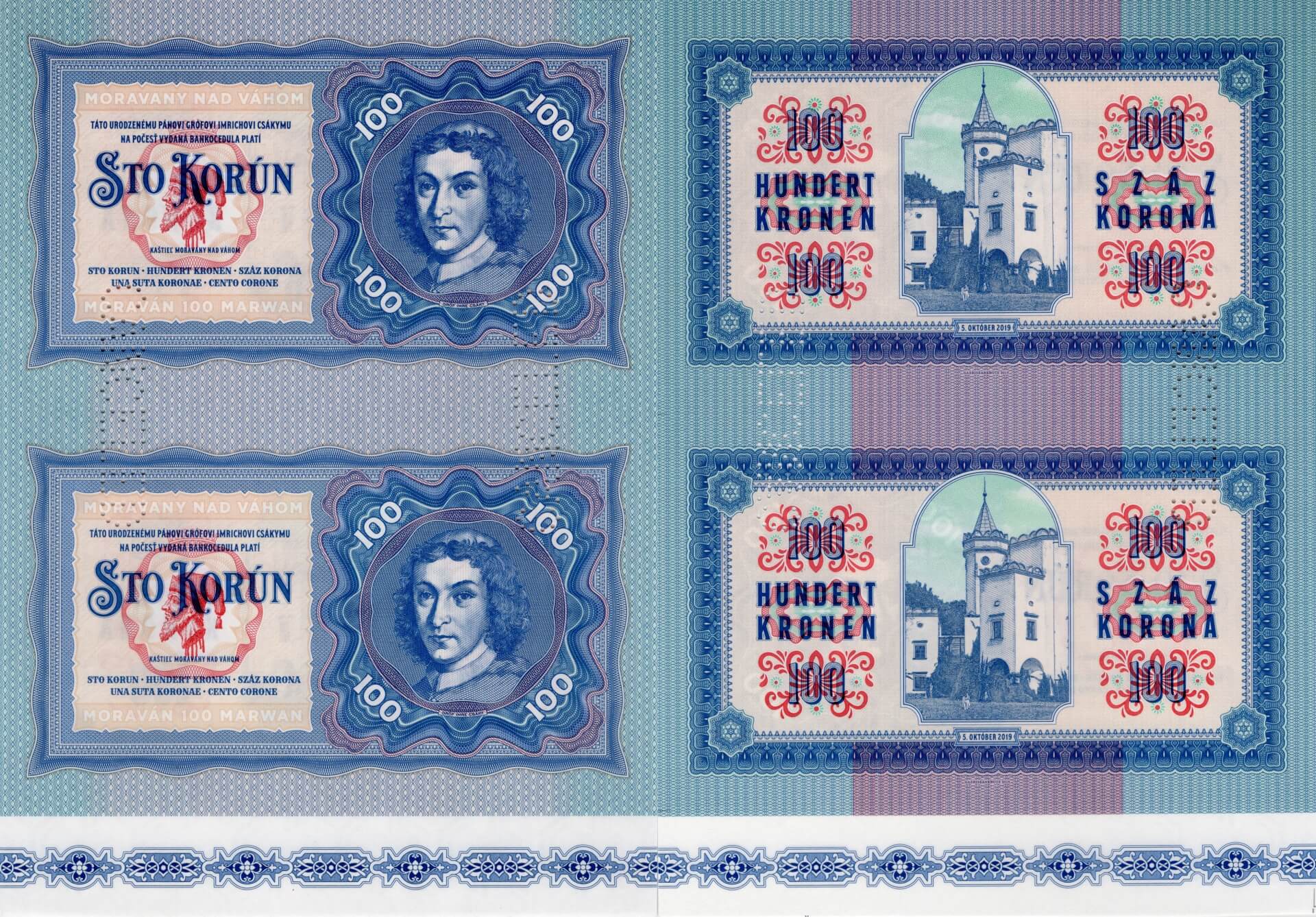 Aršík 100 korún Moravany Posted in 2019, Aršíky a ostatní Rozměry (mm): 169×233 Číslo: Bez číslovače s perforací CANCELED Rozměry (mm): 169×233 Číslo: Bez číslovače s perforací CANCELED s podpisem Mateje Gábriše