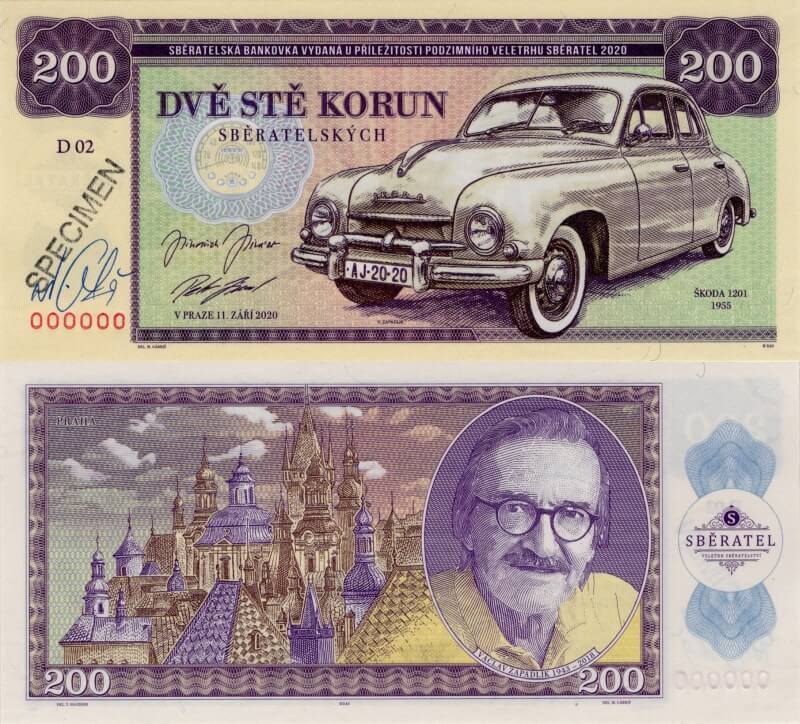 200 korun Zapadlík Škoda 1201 Posted in 2020 Rozměry (mm): 153 x 70 Číslo: Anulát D 02 000000 SPECIMEN s podpisem Mateje Gábriše