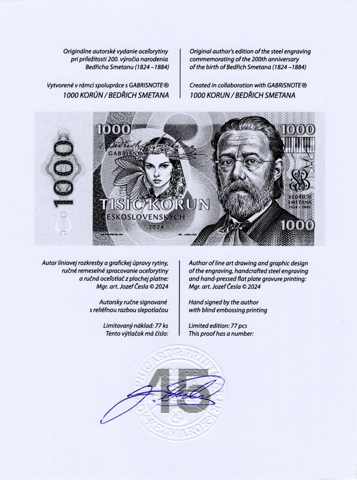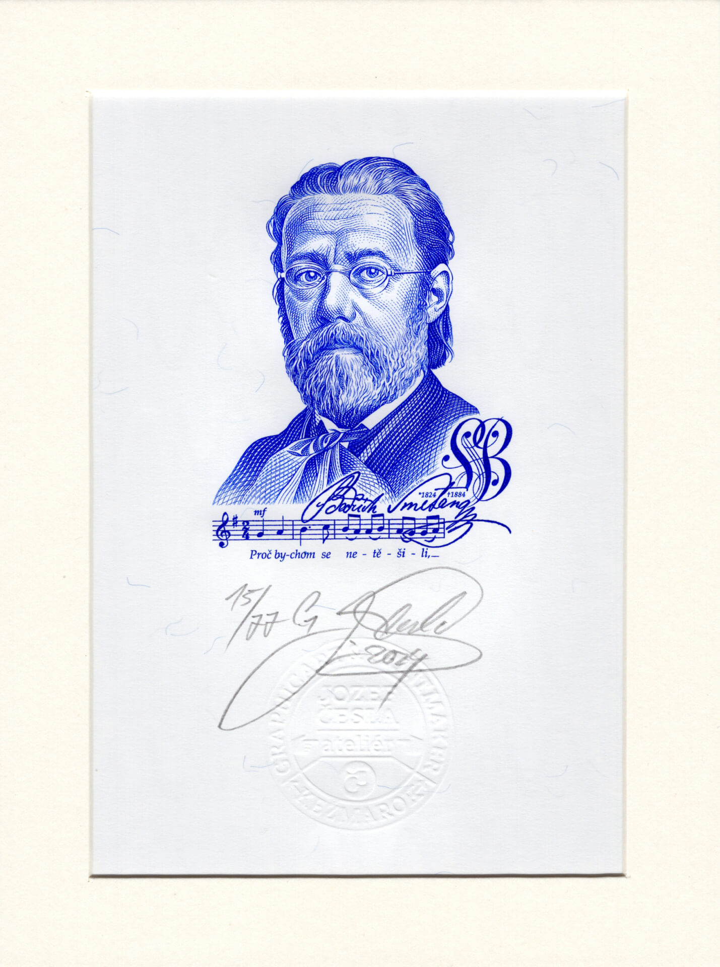 Bedřich Smetana – Jozef Česla ocelorytina Posted in 2025, Aršíky a ostatní Rozměry (mm): Číslo: Číslo 15/77 Bedřich Smetana ocelorytina limitovaná edice s podpisem Jozefa Česla Rozměry (mm): 153 x 71 Číslo: Anulát MG01 000000 s podpisem Jozefa Česla